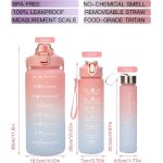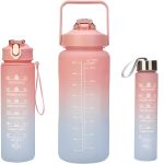 Este juego incluye tres botellas de agua de colores degradados, cada una con una cita motivadora en la parte delantera y medidas de volumen en la parte trasera.