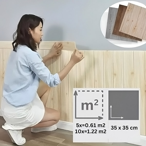 Cada paquete contiene 5 unidades (35×35 cm), que cubren 0,61 m². Antes de empezar, calcula cuántos paquetes necesitarás en función de la superficie de tu pared. ¡Compra más paquetes para espacios más grandes y disfruta de descuentos por volumen!