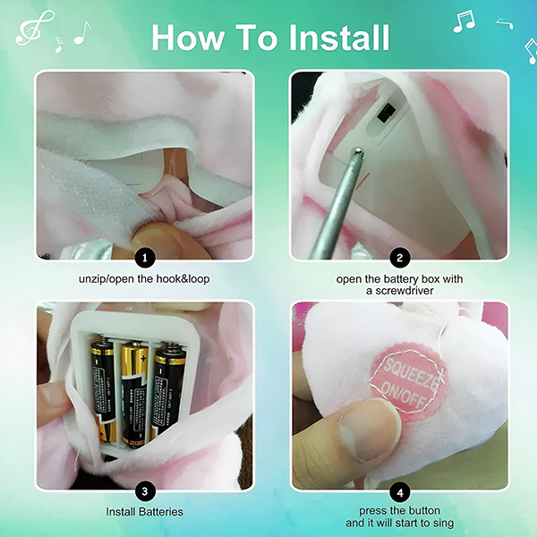 Puedes acceder fácilmente al compartimento de las pilas a través de una abertura con velcro en la parte posterior del juguete. Gira el interruptor a «ON» y comienza la magia. Roxy, fabricado con materiales de alta calidad, es suave, duradero y seguro para los niños.